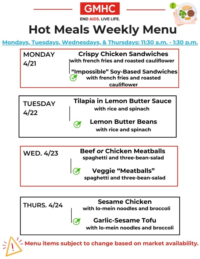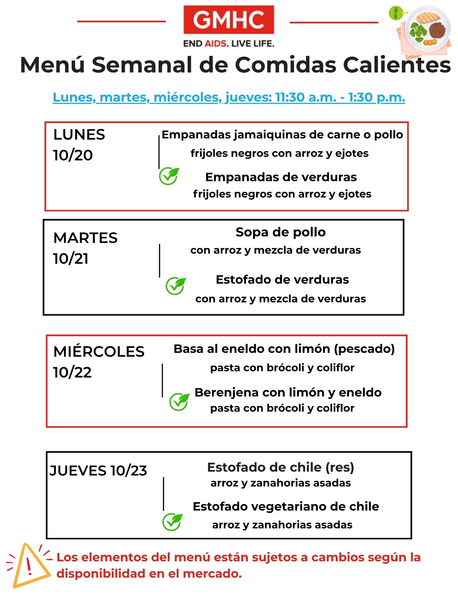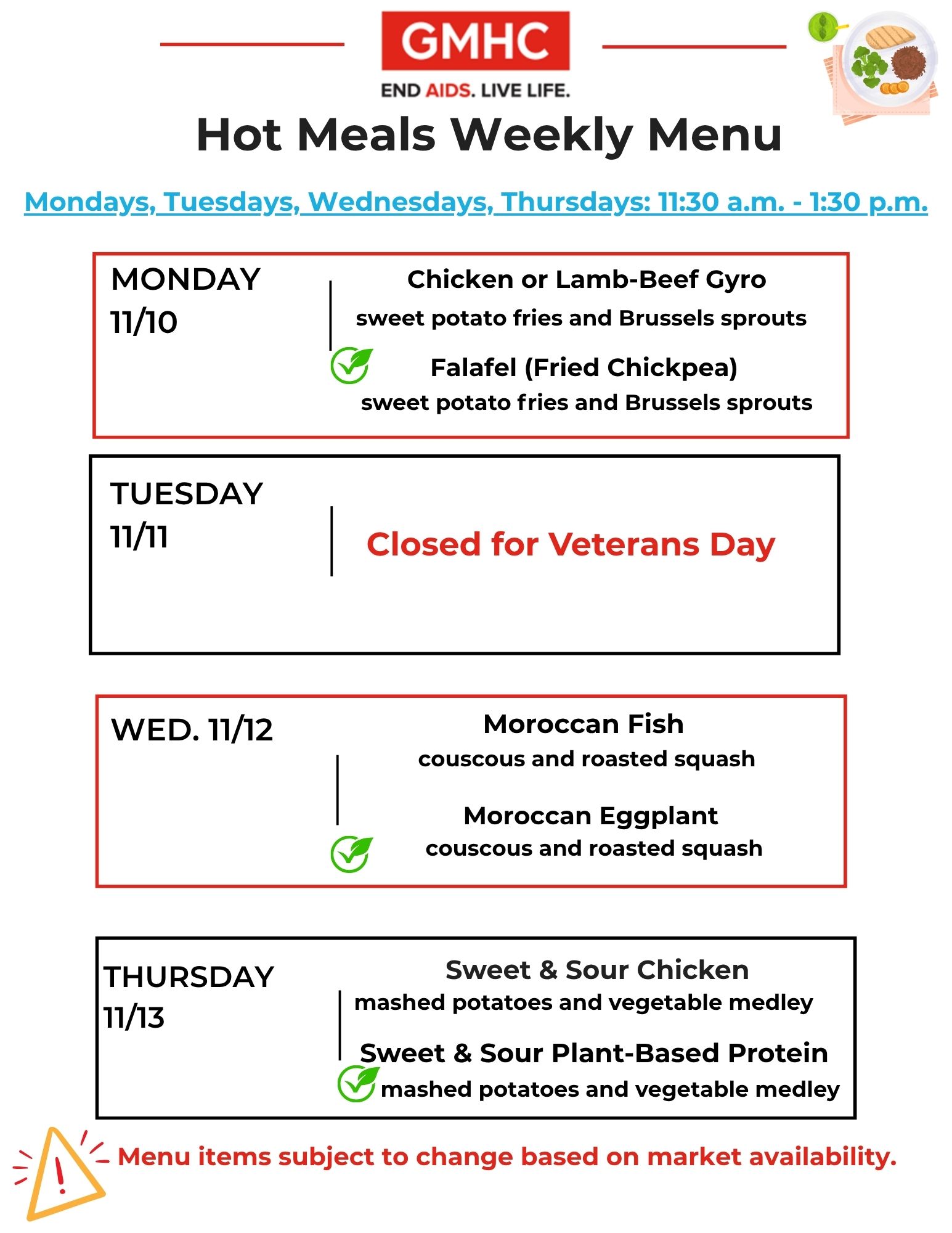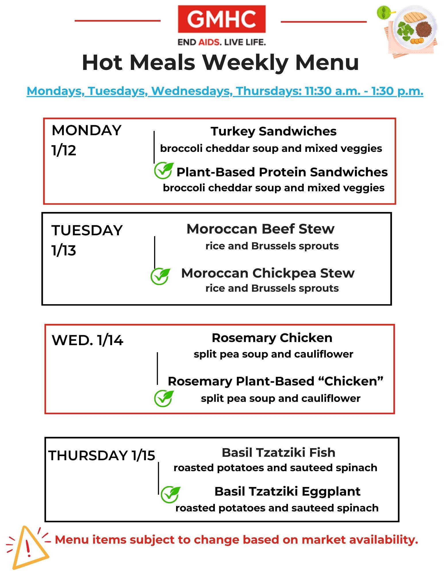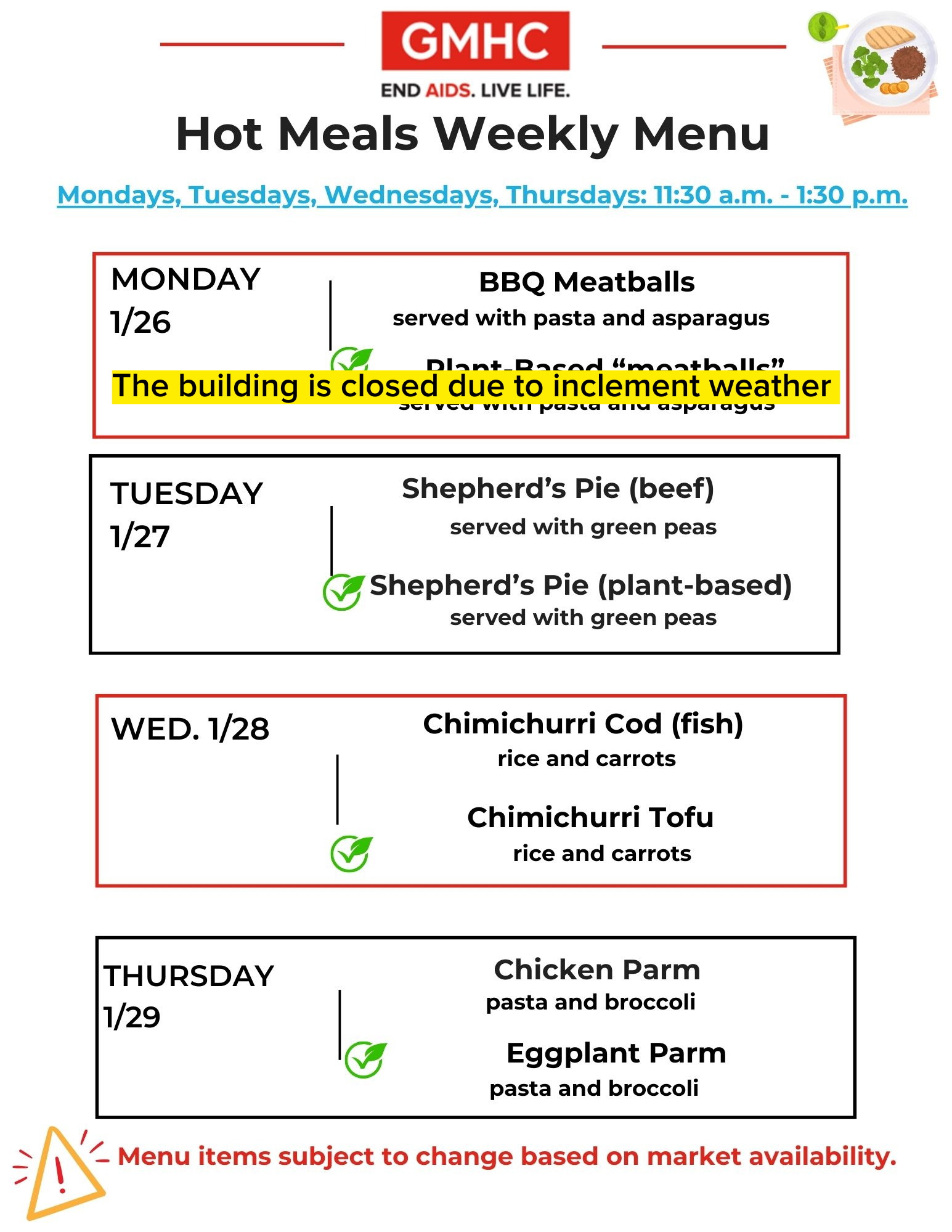 We are currently serving lunch to GMHC clients on Monday — Thursday, 11:30 a.m.–1:30 p.m. Please note the following:
