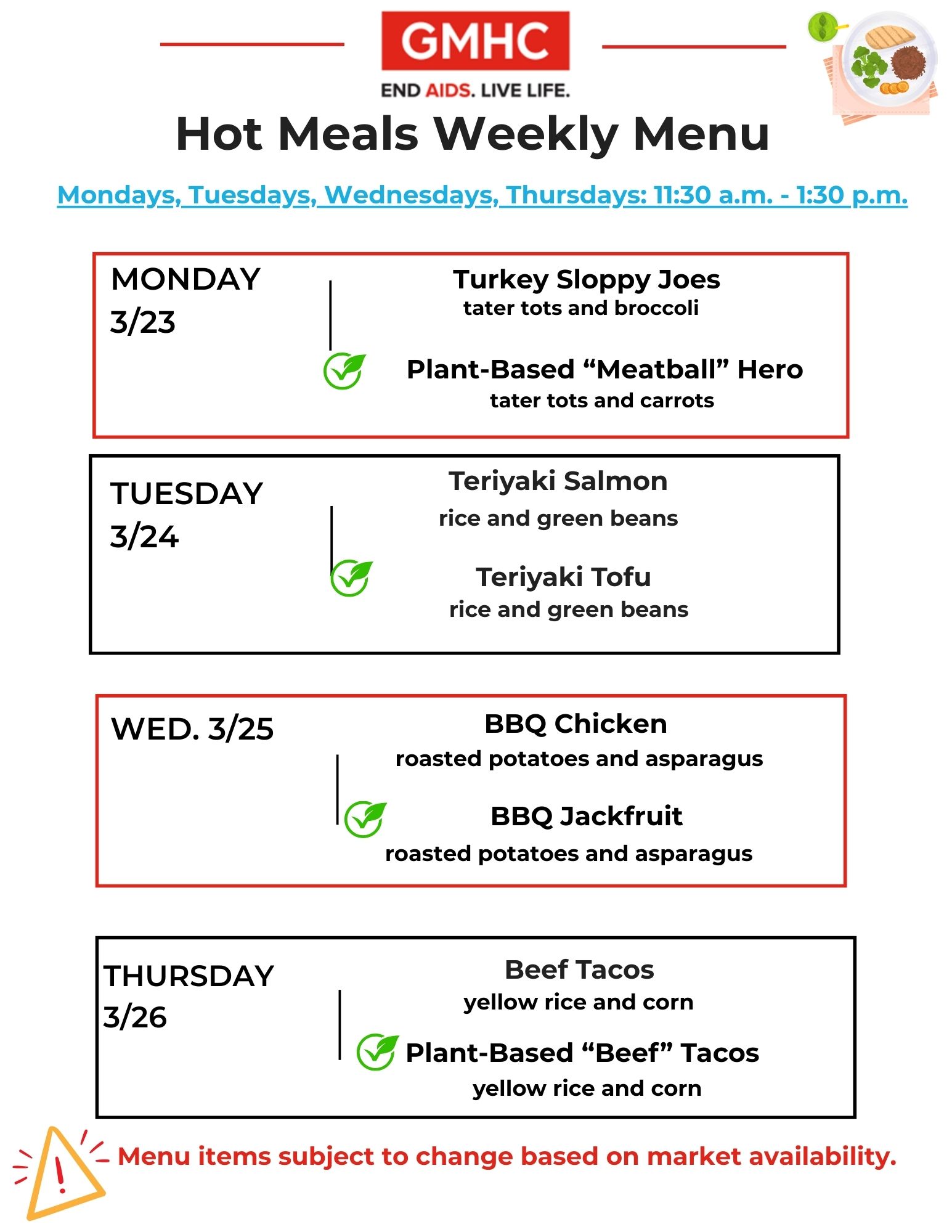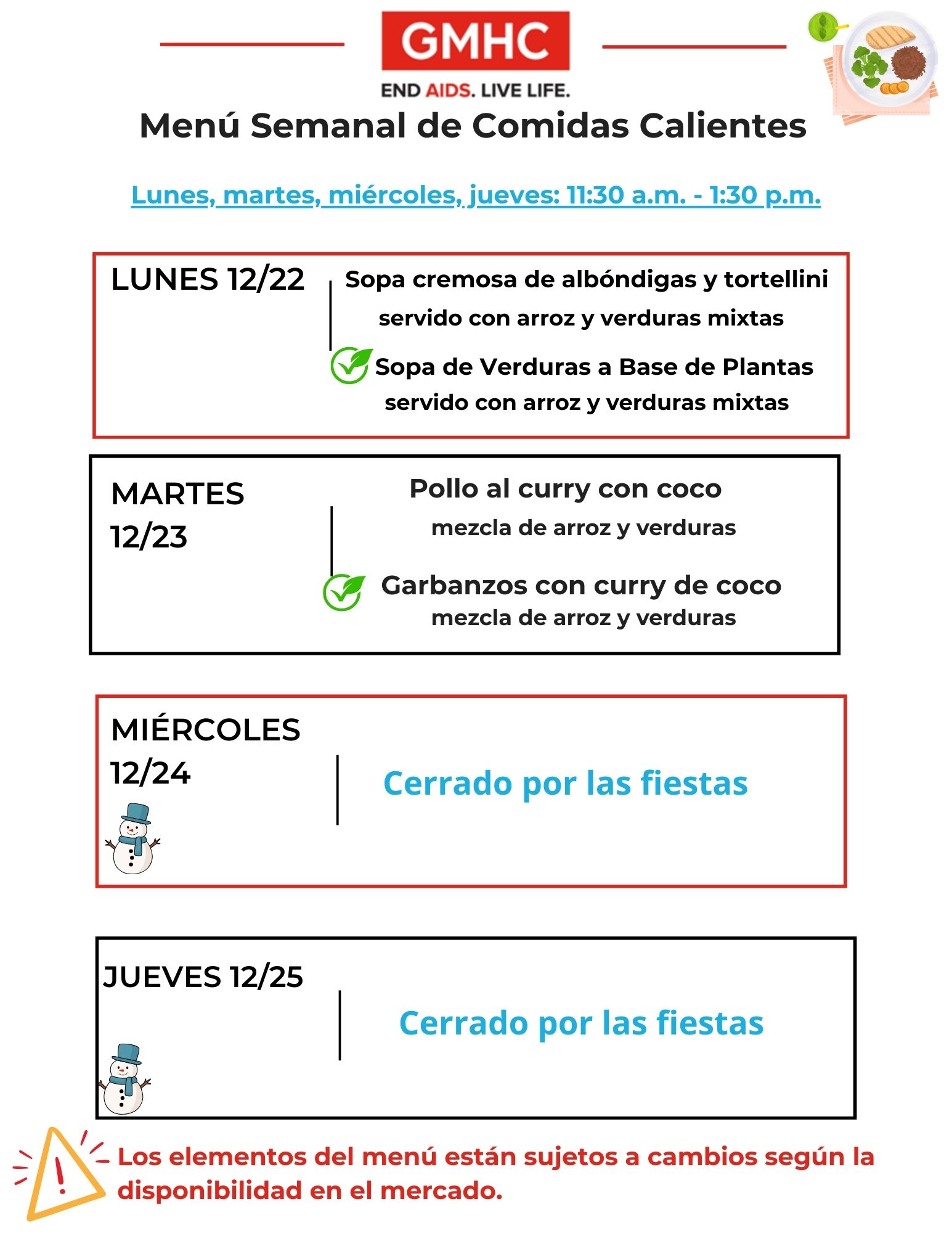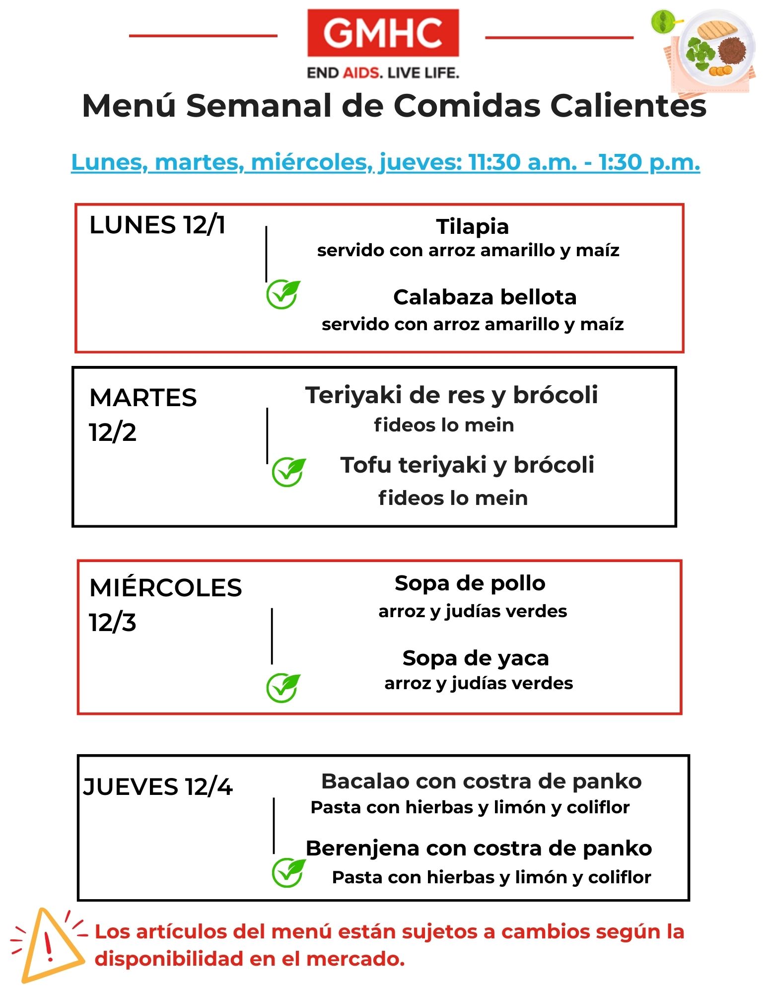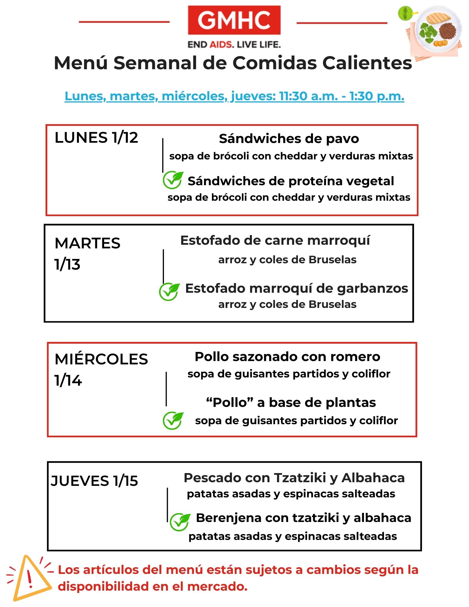 We are currently serving lunch to GMHC clients on Monday — Thursday, 11:30 a.m.–1:30 p.m. Please note the following: