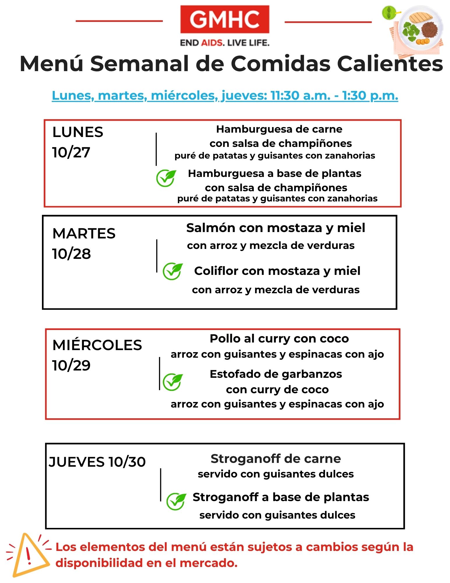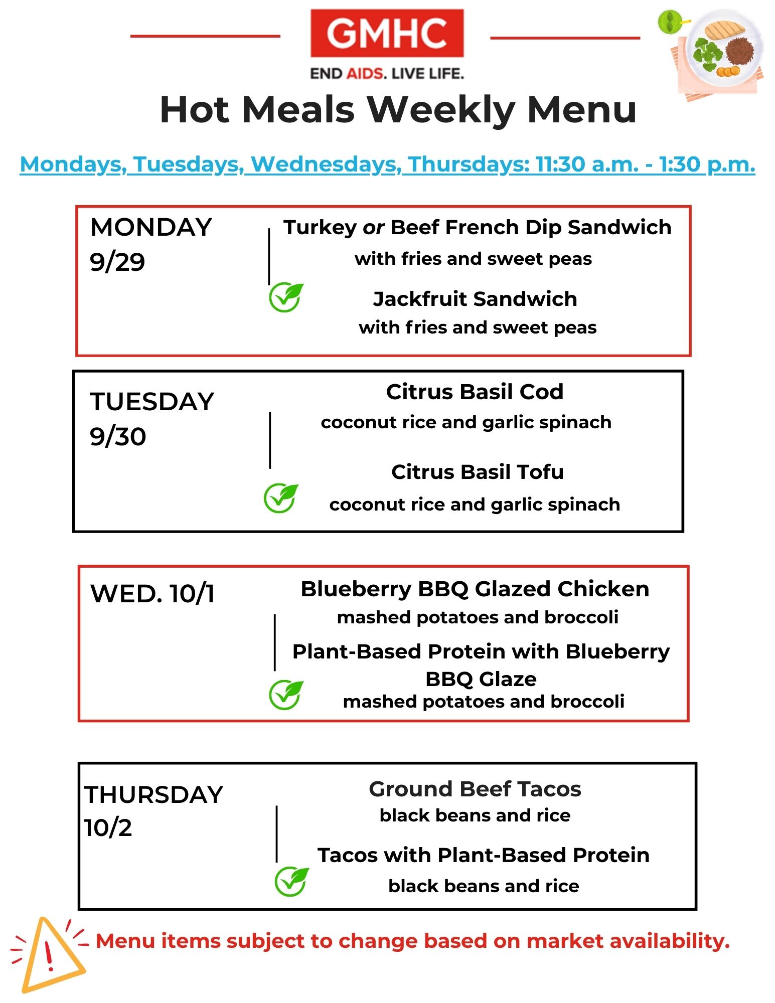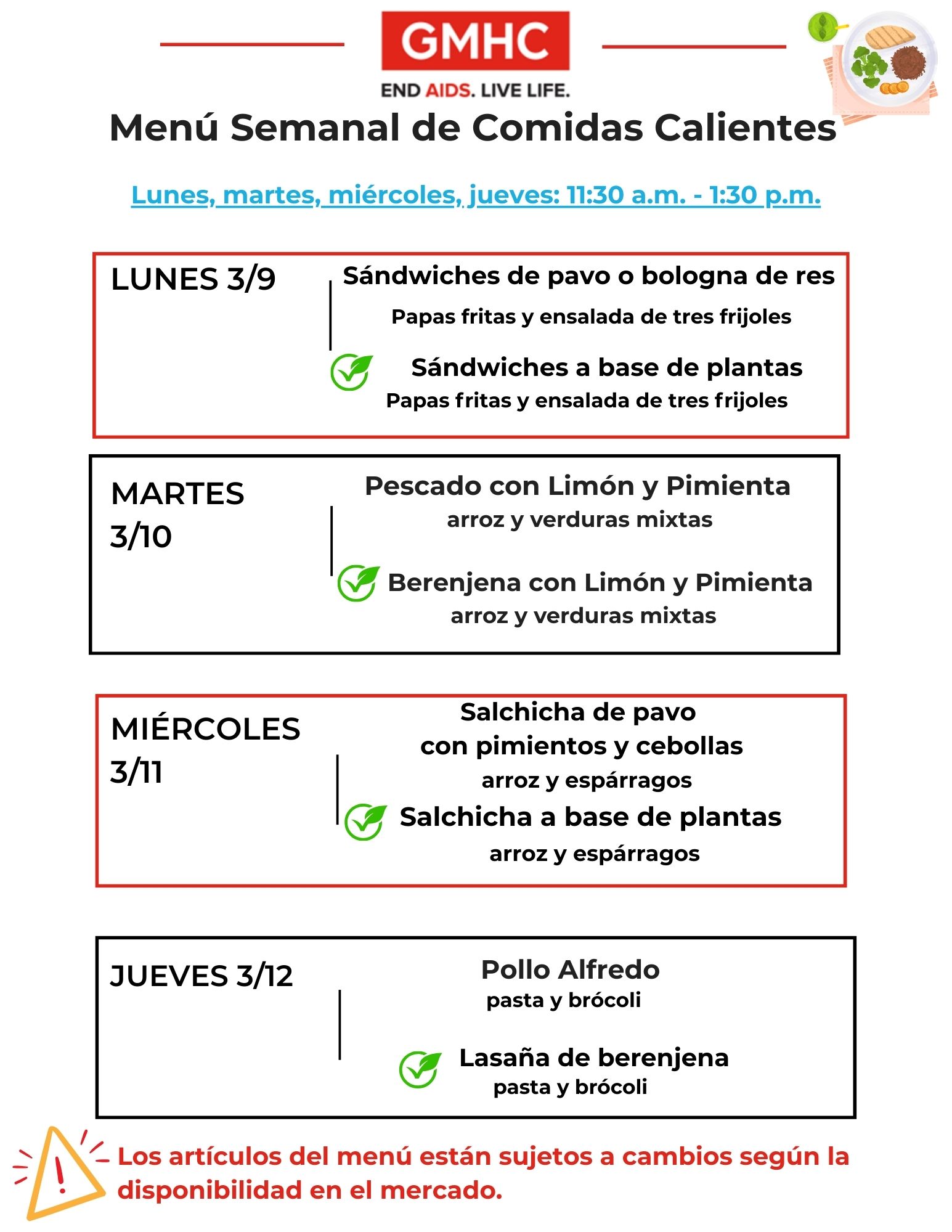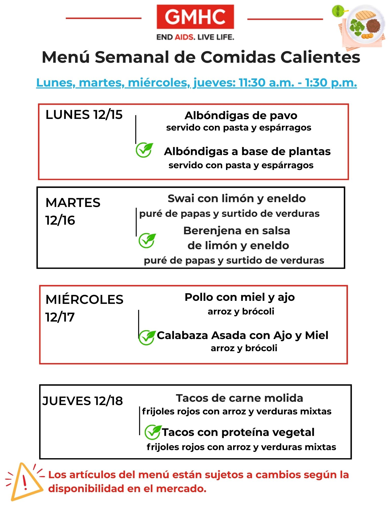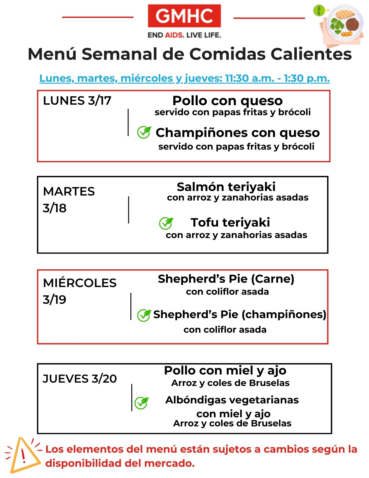 We are currently serving lunch to GMHC clients on Monday — Thursday, 11:30 a.m.–1:30 p.m. Please note the following: